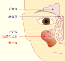 急性副鼻腔炎は風邪などのウィルス感染や、それに引き続く細菌感染が原因で起こります。鼻腔の粘膜の炎症で副鼻腔の開口部が塞がりやすくなり、副鼻腔に膿がたまります。また、風邪以外にも虫歯が原因で起こることもあります。慢性副鼻腔炎