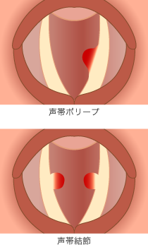 通常は左右にある声帯が触れ合い振動を起こすことによりきれいな声が発せられます。細菌やウイルスなどによる炎症や、大声を出しすぎて喉を酷使したりしますと、声帯に炎症が起きて粘膜上皮下で内出血を起こしポリープと言われる、小さな血腫ができます。これは主に片側に出来ることが多いです。左右両方の声帯に出来るイボのような突起は声帯結節と呼ばれ、これは常に大声を張りあげる男児や、喉を酷使する職業の方などに多く見られます。声帯ポリープや声帯結節になりますと、声帯に突出物があるために声門がうまく閉じなくなり粘膜波動も悪くなってしまうため、声がかすれたり、声も出にくくなり声が途中で止まったりもします。
